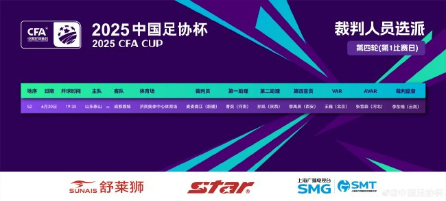 北京時間6月20日19:35,山東泰山坐鎮主場濟南奧體對陣成都蓉城 ,提江足協杯1/8決賽,執法足協麥麥提江將執法本場比賽!杯決